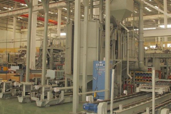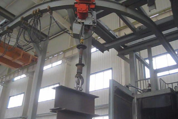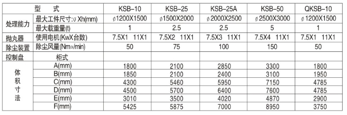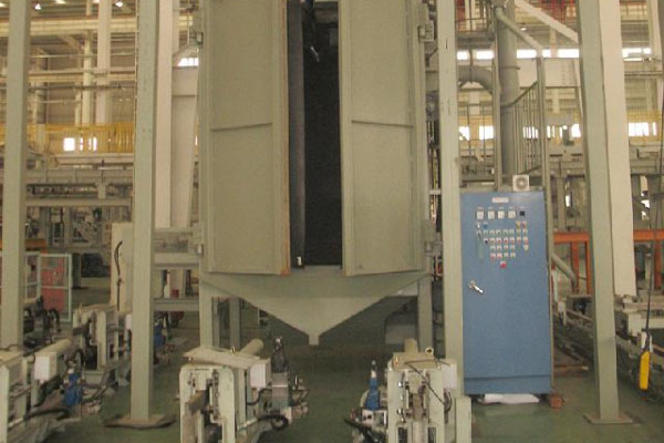 本機為吊鉤式清理設備。采用拋丸清理去掉表面型砂及氧化皮,獲得具有一定粗糙度的表面,以改善其表面質量。主要由制品搬送裝置、清理室、清理室門、彈丸循環系統、吊鉤自轉、拋丸器、除塵管路、電控系統等部分組成。被清理工件由可升降的電動葫蘆吊鉤吊離地面,并上升到設定的高度,沿著導軌平移到拋丸室中心處。門關閉后,自轉機構啟動使吊鉤緩慢旋轉,此時清理室側面的拋丸器分別從上下兩個方向對工件進行拋丸。拋射完了后,吊鉤沿導軌行走,將工件搬送到清理室外。拋丸器在清理室側面的合理布置使鋼丸可以拋射到工件的各個表面,即使是形狀很復雜的工件也會有很好的清理效果。被拋射出的鋼丸落入下部振動篩,再由下部螺旋將鋼丸輸送到提升機下部,由提升機將鋼丸提升至分離器,粉塵、碎鋼丸、型砂等被分離出來,可以使用的鋼丸流回到拋丸器,拋打下來的芯鐵、飛邊等異物在振動篩前端被篩出,產生的粉塵由除塵器除去。 特點: 1.吊鉤可以水平運行和垂直回轉,并具有升降功能,方便賬工件裝卸; 2.可靠的密封設計,有效解決了飛丸現象; 3.無地坑,室內彈丸直射部位采用硬防護 4.吊鉤運行軌道有多種布置形式可供選擇; 用途: 適用于中大型,形狀復雜及怕碰撞的工件表面的清砂、除銹、去氧化皮;