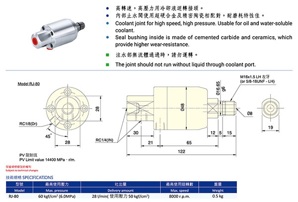 冷卻液回轉接頭內附止水閥自動開閉機構(RJ-90)